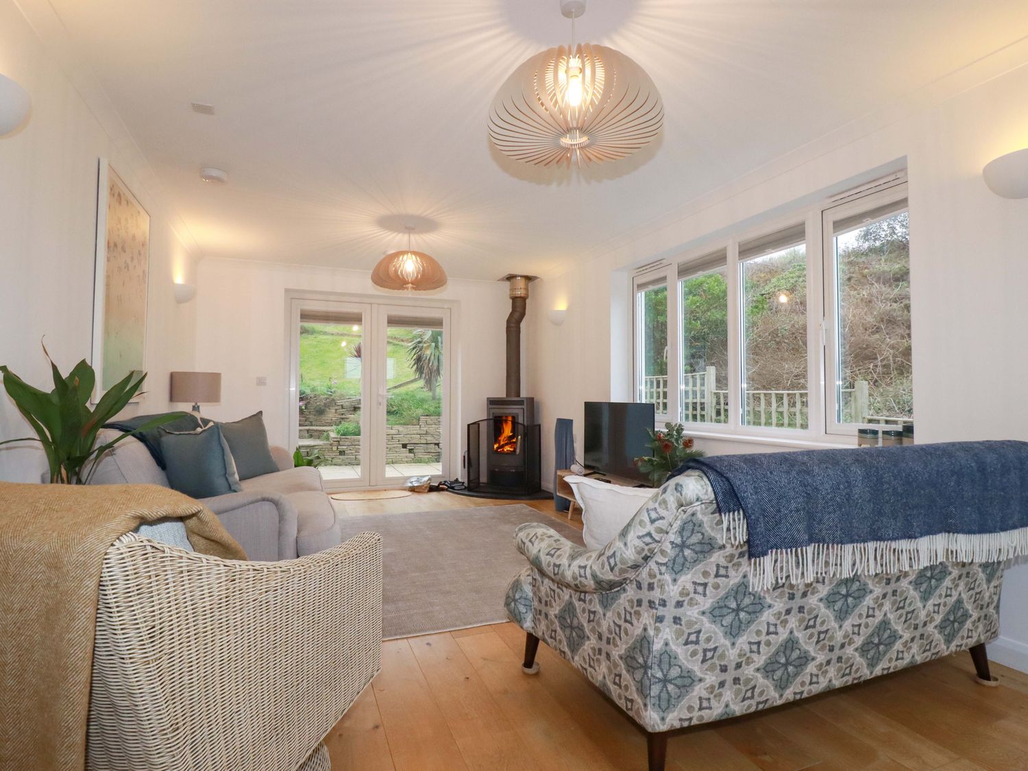 Inside, the sitting room features a wooden floor softened by a textured rug, with sofas and an armchair arranged around a glowing woodburning stove, while large windows frame elevated views of the shoreline and countryside fields.